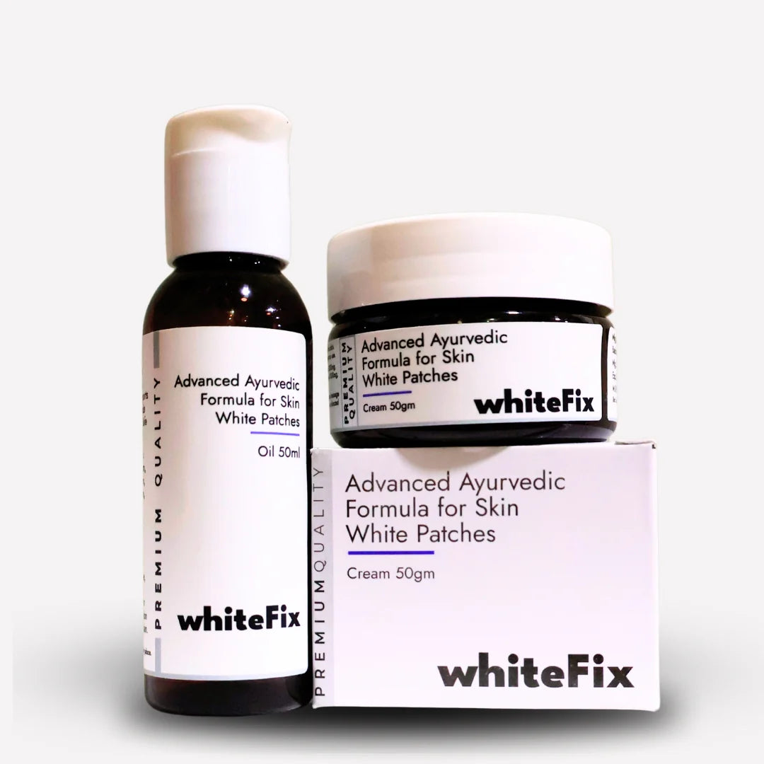 WhiteFix Ayurvedic Combo Kit combines the nourishing power of WhiteFix Oil with the soothing protection of WhiteFix Cream, offering a complete Ayurvedic approach to care for white skin patches. Enriched with time-tested herbs like Bakuchi, Neem, Manjistha, and Chandan, this dual-action formula supports melanin regeneration, helps restore natural skin tone, improves circulation, and promotes skin balance from within and outside.